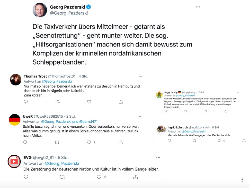 Natürlich hat Pazderski unter seinen Followern so zynische Würste, die seine Hassgedanken ungebremst weiterdenken. Zum Beispiel den schreibenden Flakhelfer, der sagt: „…war letztens zu Besuch in Hamburg. Und dachte, ich wäre in Nigeria oder Nairobi. Zum Kotzen.“